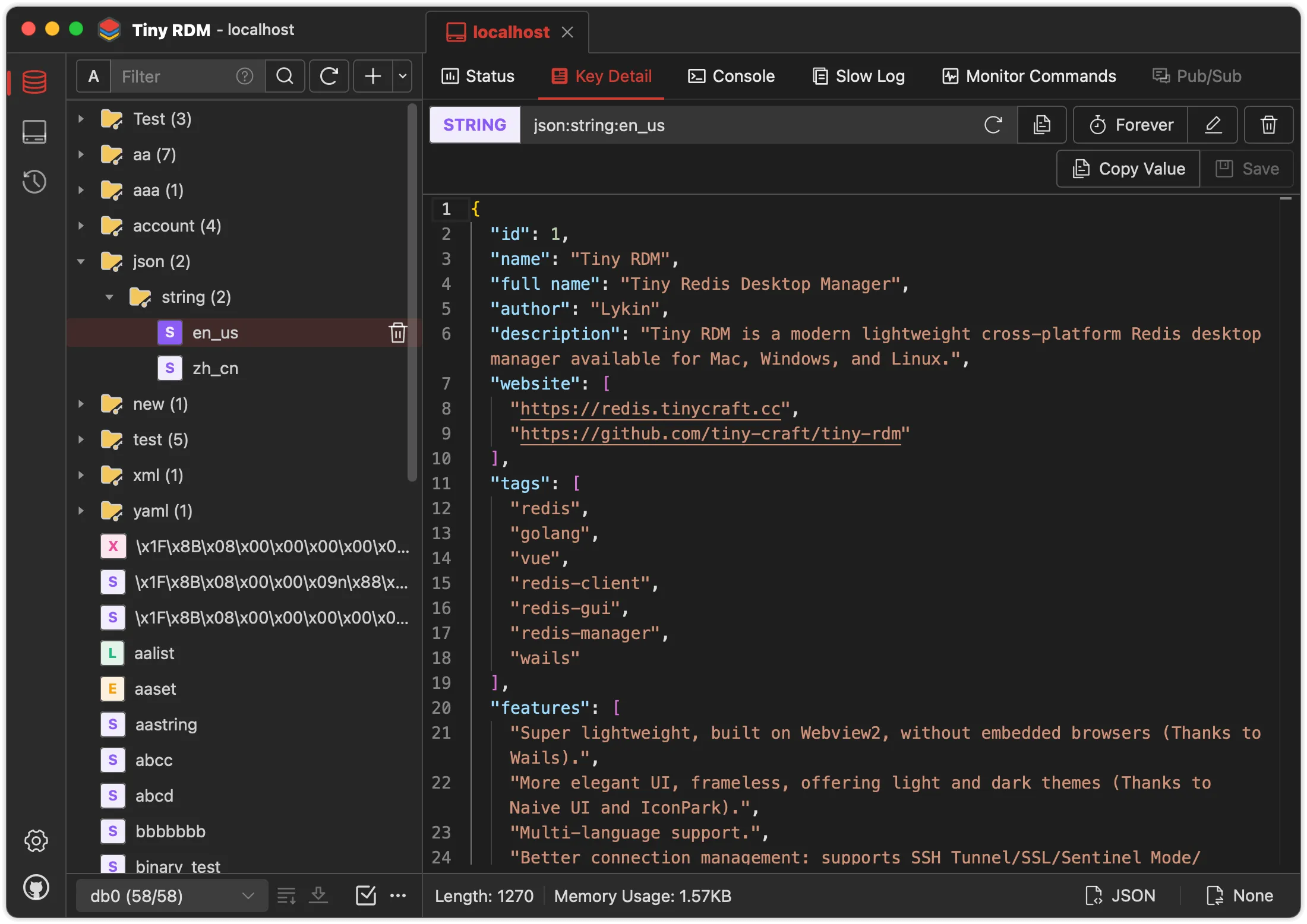 The Tiny RDM application is an open-source, modern lightweight Redis GUI. It has a beautful UI, intuitive Redis database management, and compatible with Windows, Mac, and Linux. It provides visual key-value data operations, supports various data decoding and viewing options, built-in console for executing commands, slow log queries and more.
